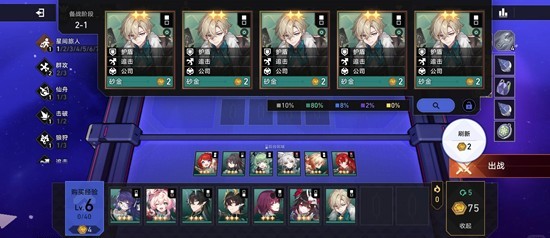 拿二费角色,砂金留着三星才卖,别的角色二星就卖,前期顺便刷长线利好次数,获得一金币刷新。
