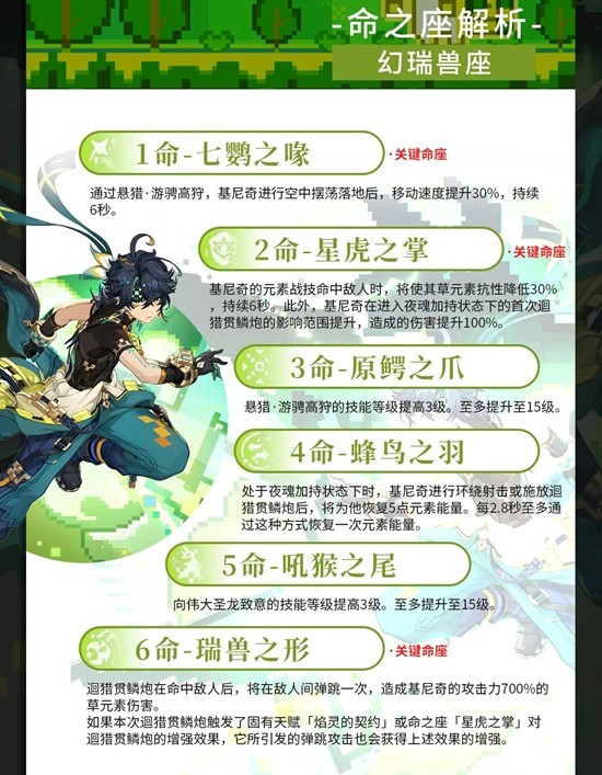 基尼奇的元素战技命中敌人时,将使其草元素抗性降低30%,持续6秒。此外,基尼奇在进入夜魂加持状态下的首次猎贯鳞炮的影响范围提升,造成的伤害提升100%。