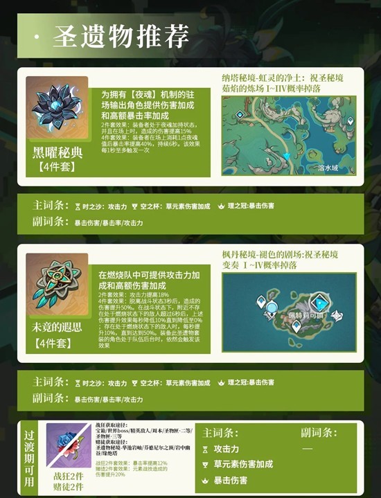 2件套效果:装备者处于夜魂加持状态,并且在场上时,造成的伤害提高15%4件套效果:装备者在场上消耗1点夜魂值后暴击率提高40%,持续6秒。该效果每1秒至多触发一次