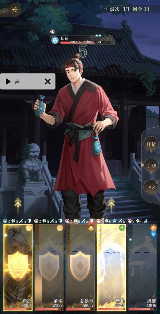 夏侯惇、董奉大招回合自己操作一下,看情况正常放,除曹植其他人没特别提就对任意小兵打。