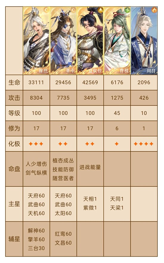 徐庶必备敌少、剑气,董奉无扶正,练度可降。