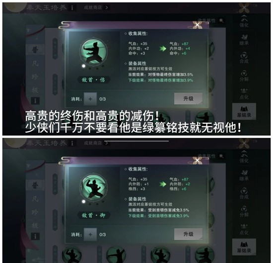 2.篆铭技的升级需要消耗一个配带该篆铭技的奉天玉,如果正好是一个高星奉天玉或者需要的词条,就可以先继承到一个狗粮奉天玉上