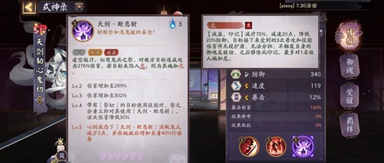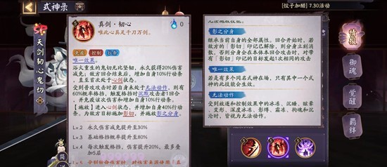二技能:永久获得30%的免伤,自拉条10%,直到首次触发心剑状态(免疫控制,期间与带有影切的目标,不会触发反击,协战,回合开始时,敌方影切印记结束,心剑状态立即解除)