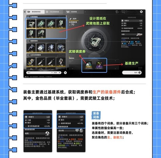装备主要通过基建系统,获取调度券和生产的装备原件后合成其中,金色品质(毕业套装),需要武陵工业技术;