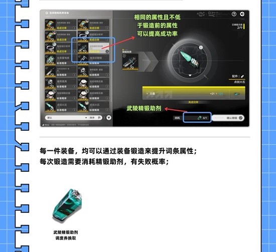 每一件装备,均可以通过装备锻造来提升词条属性;每次锻造需要消耗精锻助剂,有失败概率;