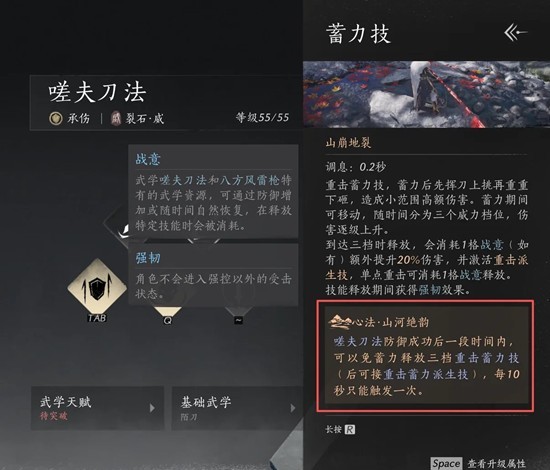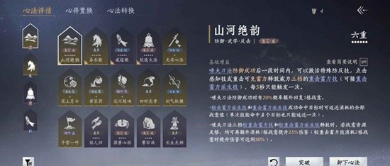 当装备上心法山河绝韵并成功防御,会出现金色防反技,也就是不用蓄力三档的重击蓄力技,当打出蓄力三档的重击蓄力技,就能激活重击派生技,也就是任务里需要的防反派生技