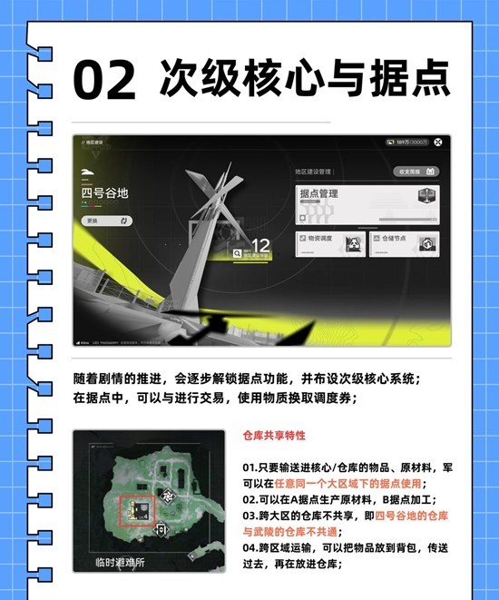 随着剧情的推进,会逐步解锁据点功能,并布设次级核心系统;在据点中,可以与进行交易,使用物质换取调度券;
