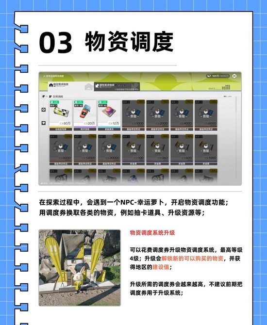 在探索过程中,会遇到一个NPC-幸运萝卜,开启物资调度功能;用调度券换取各类的物资,例如抽卡道具、升级资源等;