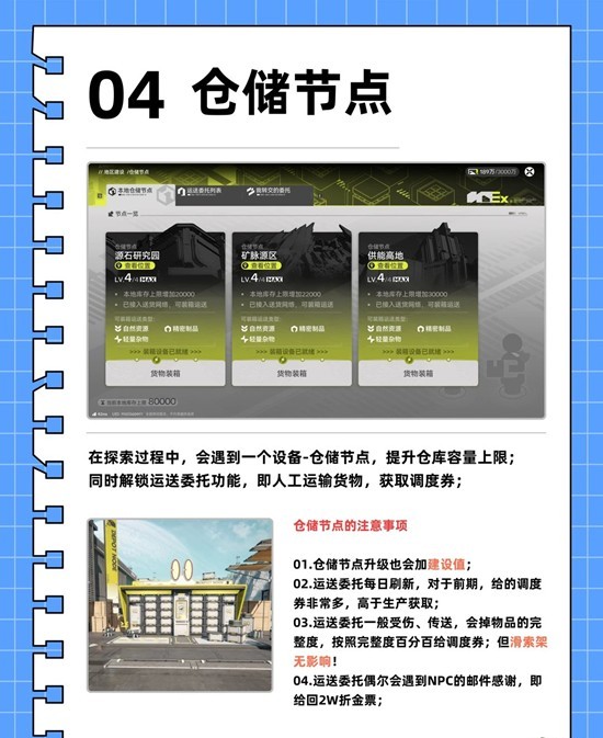 在探索过程中,会遇到一个设备-仓储节点,提升仓库容量上限;同时解锁运送委托功能,即人工运输货物,获取调度券;