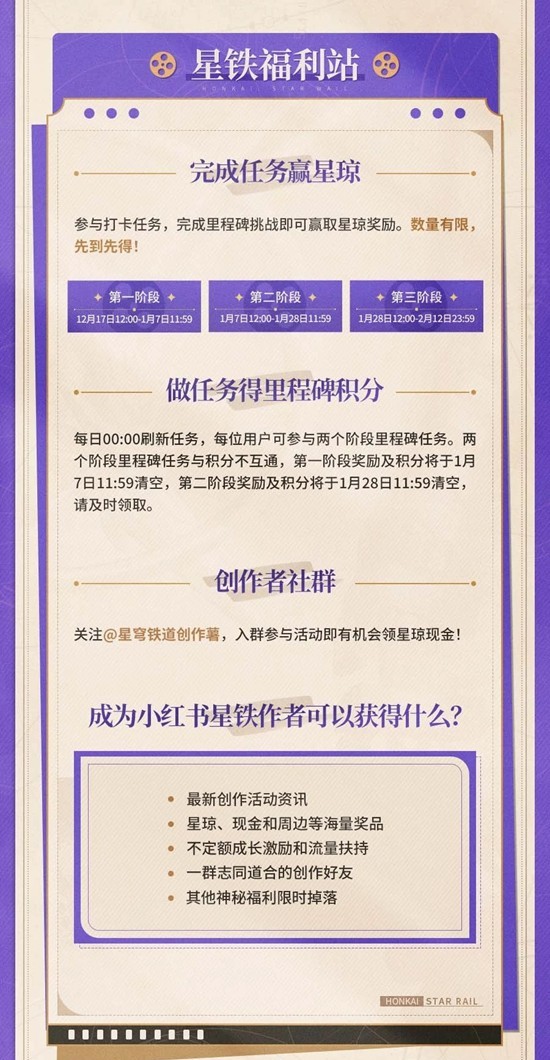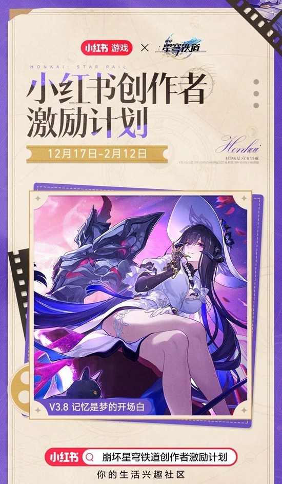 在小红书平台,带话题#崩坏星穹铁道 和 #崩坏星穹铁道创作者激励计划 ,围绕《崩坏:星穹铁道》发布原创作品,即可参与活动获得现金红包、游戏星琼等奖励。