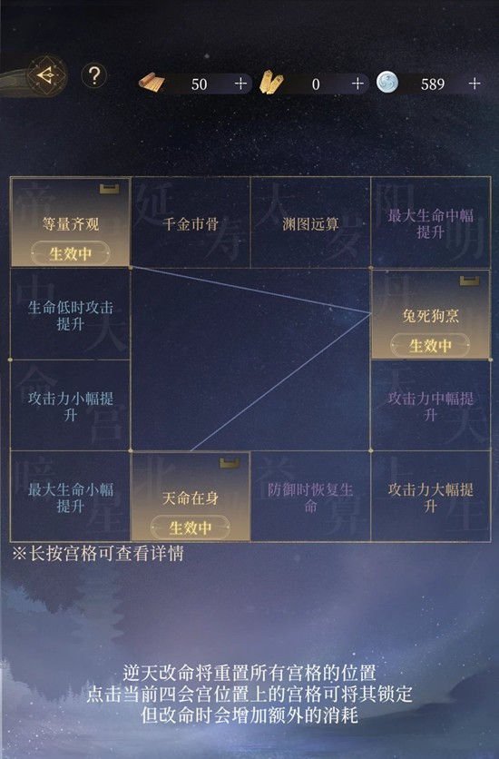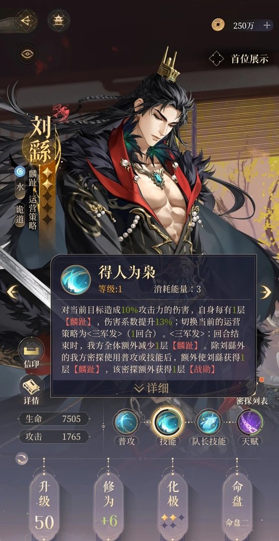等量齐观:3n回合刘繇不发[麟趾]。上3个诡道时,诡道行动提升刘繇4技能增伤,可叠20层。诡道密探死亡或离场,刘繇水属增伤提升20,可叠4层。