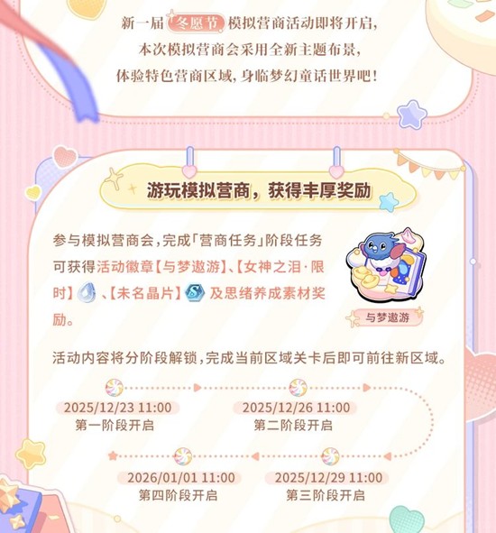 -参与模拟营商会,完成「营商任务」阶段任务可获得活动徽章【与梦遨游】、【女神之泪·限时】、【未名晶片】及思绪养成素材奖励