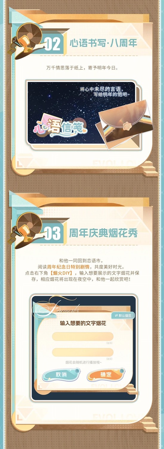 和他一同回到恋语市,阅读周年纪念日特别剧情,还可DIY文字烟花哦!
