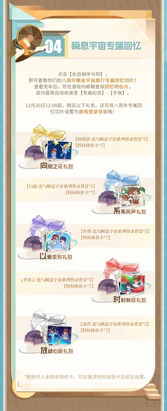 以爱求知礼包:购买立得【许墨·恋与瞬息宇宙系列登录背景*5、特权体验卡*7】,售价18元,活动期间限购1次。