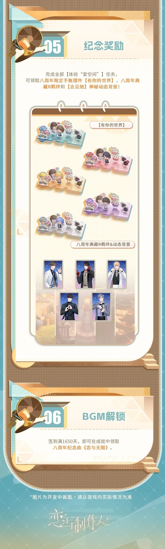 完成全部【体验“爱空间”】任务,可领取八周年限定手账摆件【有你的世界】、八周年典藏R羁绊和【去见他】神秘动态背景!