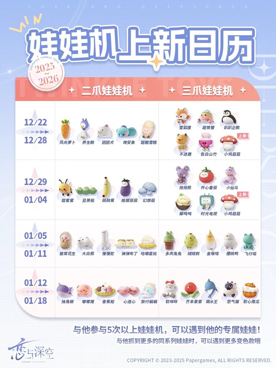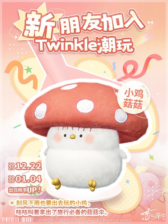 恋与深空「娃娃机上新」小鸡菇菇12月22日加入娃娃机~2025年12月22日~2026年1月4日,小鸡菇菇在三爪娃娃机的概率将会提升。2026年1月5日~1月11日,咕嘟蛋挞在二爪娃娃机等待和猎人们再见,后续也将跟随常驻娃娃轮换出现~一起来和小编看看吧~