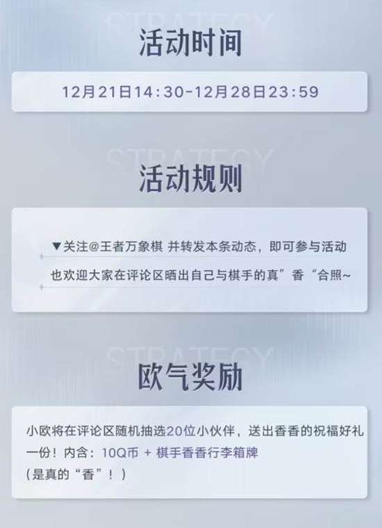 王者万象棋冬季测试即将开启,香香携棋手小伙伴们邀你突破次元壁!12月21日14:30-12月28日23:59,真“香”合照活动限时上线——上传你与棋手的自拍,AI一键生成俯拍时尚大片,轻松赢10Q币+棋手香香行李箱牌,让你的本命英雄以全新棋手形象同框出镜!