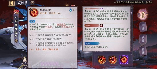 三技能:进入林隐2回合,sp红叶攻击无视防御,全体有方提升防御,友方受到伤害对伤害来源附加1层叶烬。