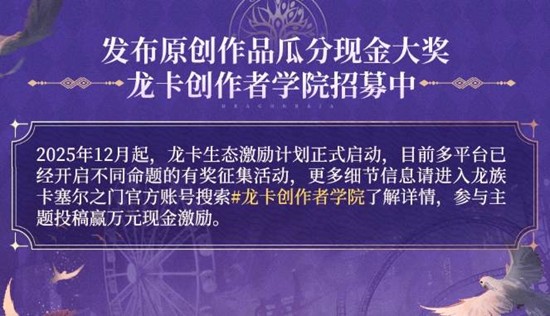 12月起,龙卡生态激励计划正式启动!在B站、微博、抖音带话题#龙卡创作者学院#发布原创作品(视频、手绘、攻略、COS均可),即可参与万元现金瓜分,月度TOP10更将额外获得官方签约机会与专属流量扶持。