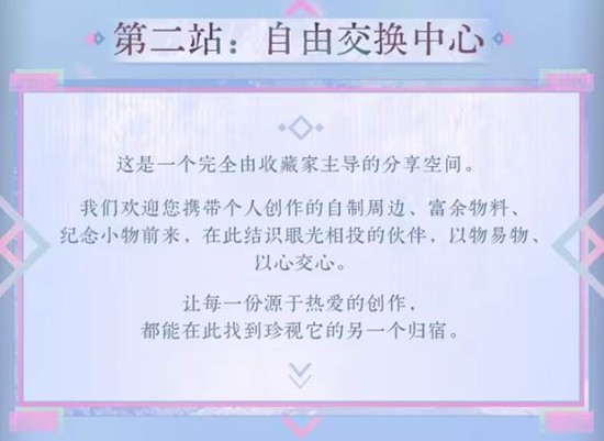 完全由玩家主导的分享空间!官方鼓励收藏家携带个人创作的自制周边、富余物料、纪念小物前来,以物易物、以心交心。现场提供“交换桌”与“故事墙”,写下物品背后故事即可挂上墙,寻找眼光相投的伙伴;每一份源于热爱的创作,都能在此找到珍视它的归宿。