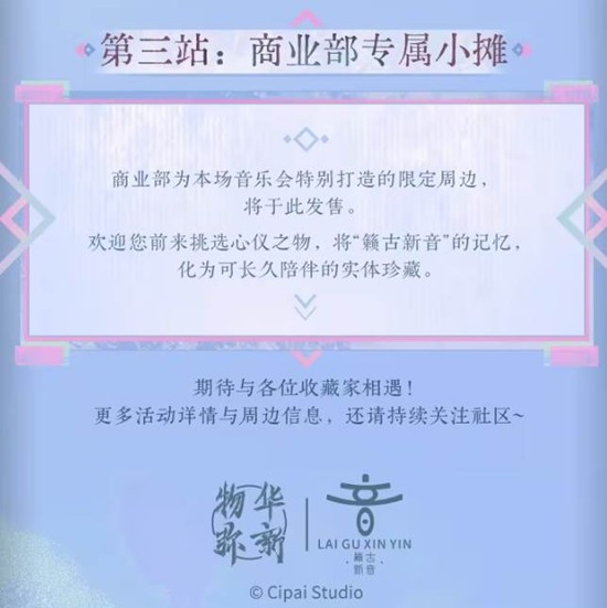 活动时间与地点将陆续在官方微博、B站社区及QQ群公布,收藏家可提前加入「籁古新音」话题,上传自己想交换的周边照片,官方将随机抽选20位赠送“提前入场券”,可比别人早1小时进场挑选限定商品。