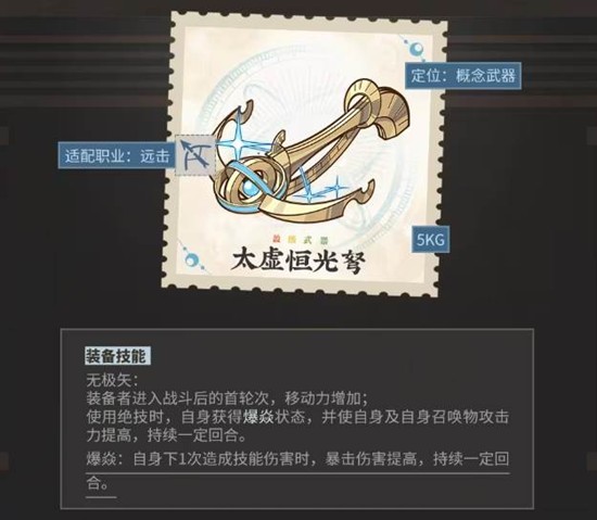 物华弥新2.6(上)版本起,博行派遣公司与「无根之木」合作推出盈级概念武器「太虚恒光」系列,共五件:盾、剑、弩、仪、炮,分属宿卫、轻锐、远击、构木、战略五大职业,统一12KG以下重量,首轮次移动力提升成为套装标签。