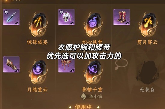 内功 新稀有 昆吾 鸣沙 断金戈决必上。其他融甲缝虚 破戟 融甲 破霄 锐缝里面选二看进功分选择 优先凑3金3火一木