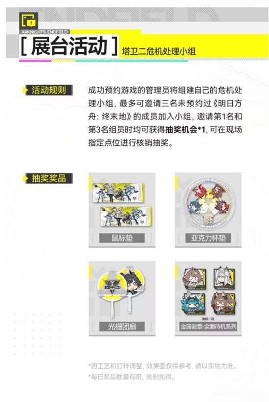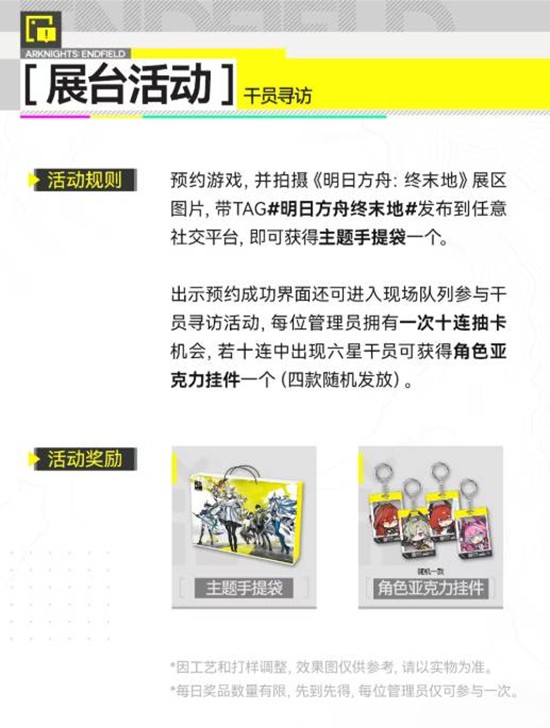 现场预约游戏并拍摄终末地展区照片,带#明日方舟终末地#发布至任意社交平台,即可领取主题手提袋一份,每日数量有限,先到先得。