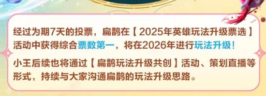 历时七日的「小王开麦节·2025英雄玩法升级票选」今日正式收官。官方数据显示,扁鹊以“23,007,381票、升级占比97.7%”的绝对优势夺得综合票数第一,确认将在2026年迎来玩法全面升级,成为明年首位“英雄共创”主角。