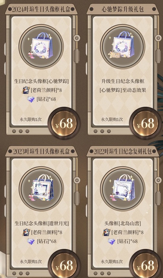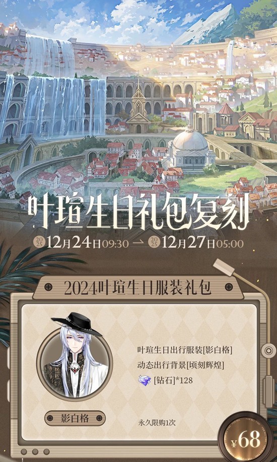 12月24日09:30-12月27日05:00,叶瑄往期多款生日服装礼包、头像框礼包返场,欢迎前往[采购]-[生日复刻]选购。