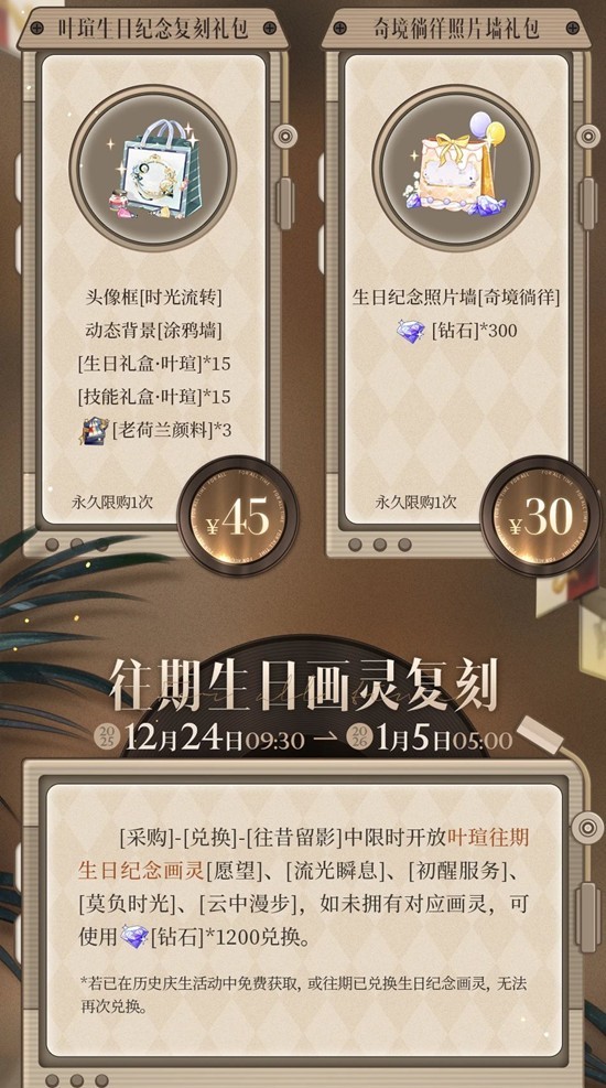 12月24日09:30 - 2026年1月5日05:00,可在[兑换]-[往昔留影]中兑换叶瑄往期生日纪念画灵。