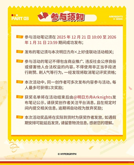 活动期间,发布本次【明日方舟×上好佳】相关内容笔记,并携带#明日方舟上好佳联动 话题,即可参与本次笔记征集活动。有关联动的二创、线下打卡、周边展示等均可参与。