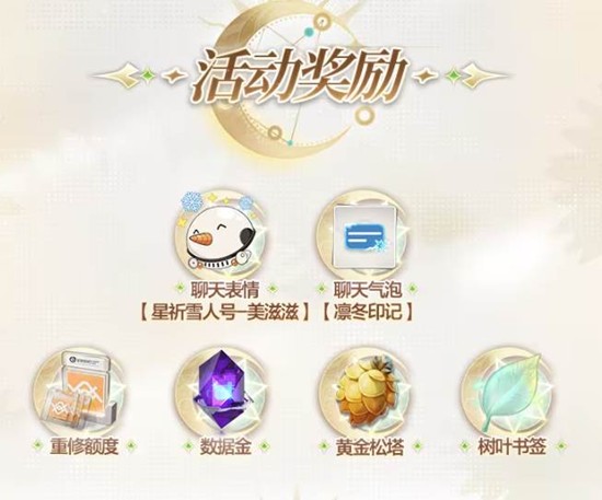 参与活动可以获得包括聊天表情【星祈雪人号-美滋滋】、聊天气泡【凛冬印记】、重修额度、数据金、黄金松塔和树叶书签在内的多种奖励。