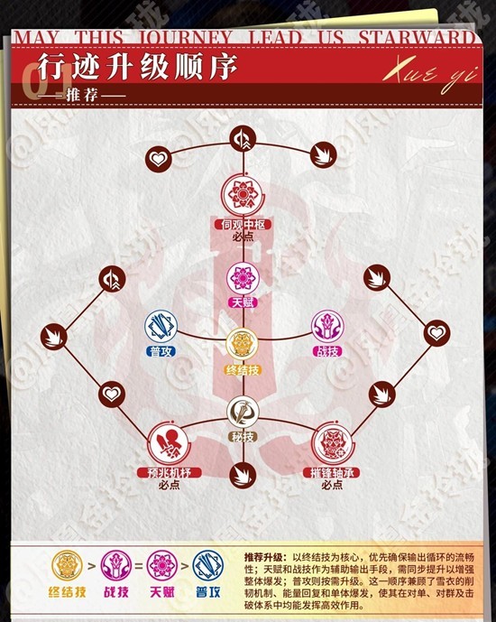 推荐升级:以终结技为核心,优先确保输出循环的流畅性;天赋和战技作为辅助输出手段,需同步提升以增强整体爆发;普攻则按需升级。这一顺序兼顾了雪衣的削韧机制、能量回复和单体爆发,使其在对单、对群及击破体系中均能发挥高效作用。