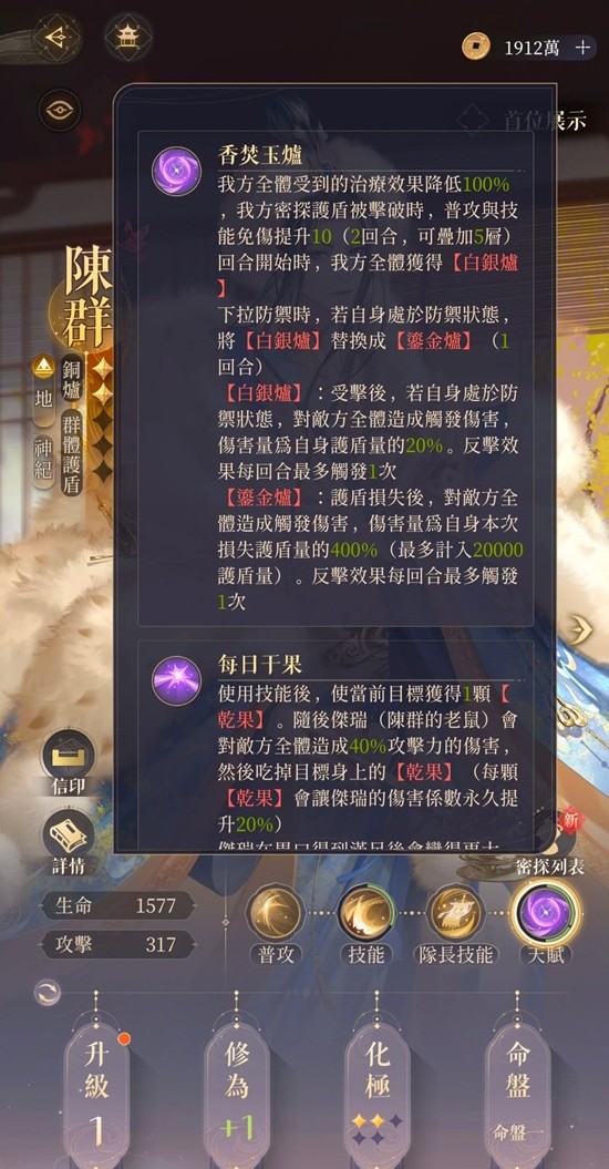 宝篆浮烟:我方只有【地水】密探时,白银炉获得额外效果,地水增伤提升护盾量*0.2%,最高50%。
