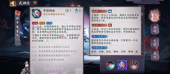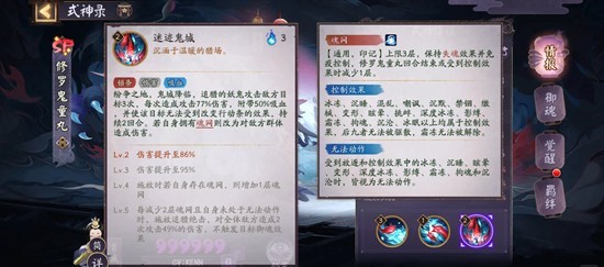 三技能:选中敌方目标,目标会被锁条,若自身有魂网则变为对敌方全体造成伤害。每减少2层魂网,对敌方全体造成2次伤害。不触发目标御魂。