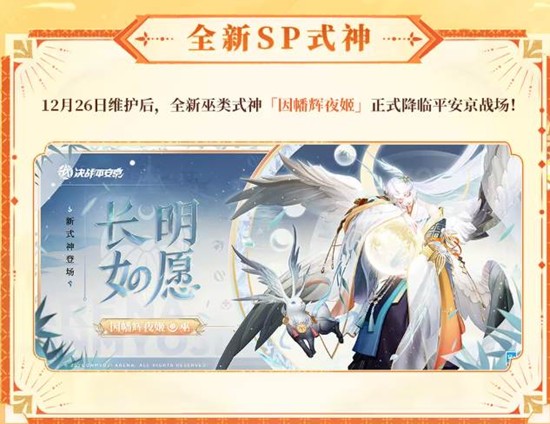 12月26日维护后,决战平安京八周年主题版本「海国VS平安京」正式开启,全新巫类式神因幡辉夜姬携月影降临,普攻可弹射星屑,大招在战场张开月环领域,为队友附加护盾与攻速加成,操作上限高,预计迅速跻身高分段热门。