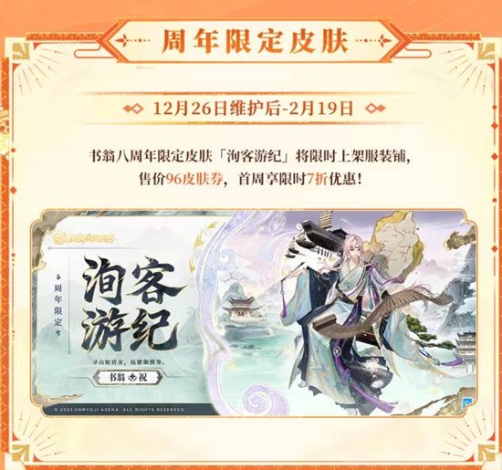 周年庆限定外观轮番登场:雪女典藏花焰庆典·渡御以花火为核,技能特效替换为鎏金焰火,售价1388达摩币;鸦天狗典藏蚀羽狩天采用黑金羽翼,突进轨迹带鸦羽残影,售价688达摩币,两款皮肤兑换期均持续到4月29日。书翁八周年限定客游纪则走国风卷轴路线,服装铺售价96皮肤券,首周7折,附带回城卷轴展开动画,收藏性价比极高。