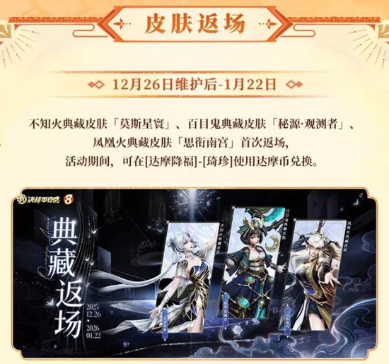 达摩降福典藏返场专区同样热闹:不知火莫斯星寰、百目鬼秘源观测者、凤凰火思衔南宫三大珍品首次回归,单价均为固定达摩币,兑换截止1月22日;荒川之主轩香如故与山鸡丰鳐兆海迎来最后一次直售返场,官方明确后续不再以任何形式上架,想要补全周年庆套系的大人请务必把握最后机会。