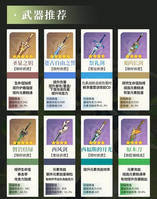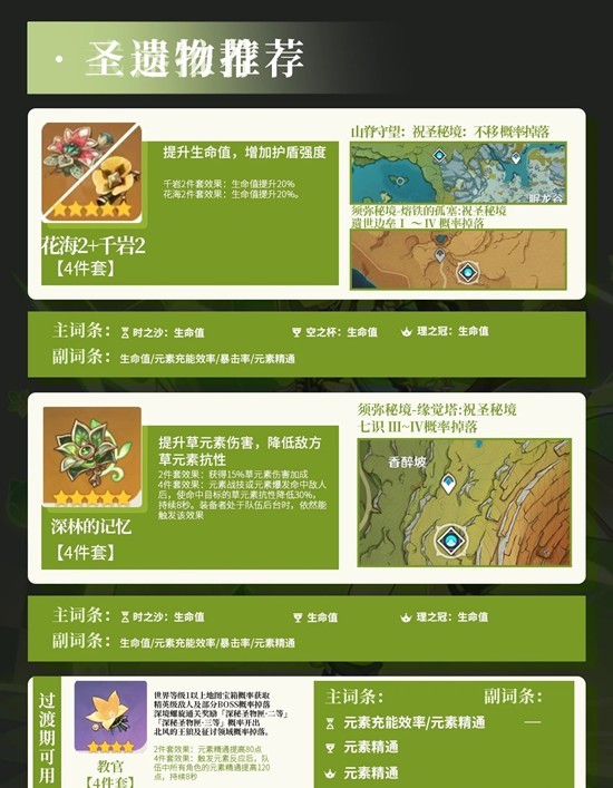 圣遗物推荐:①千岩2+花海2,②深林4,③教官4(过渡)