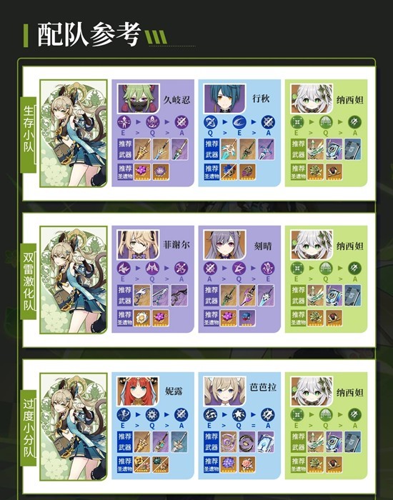 ①生存小队1:绮良良+久岐忍+行秋+纳西妲