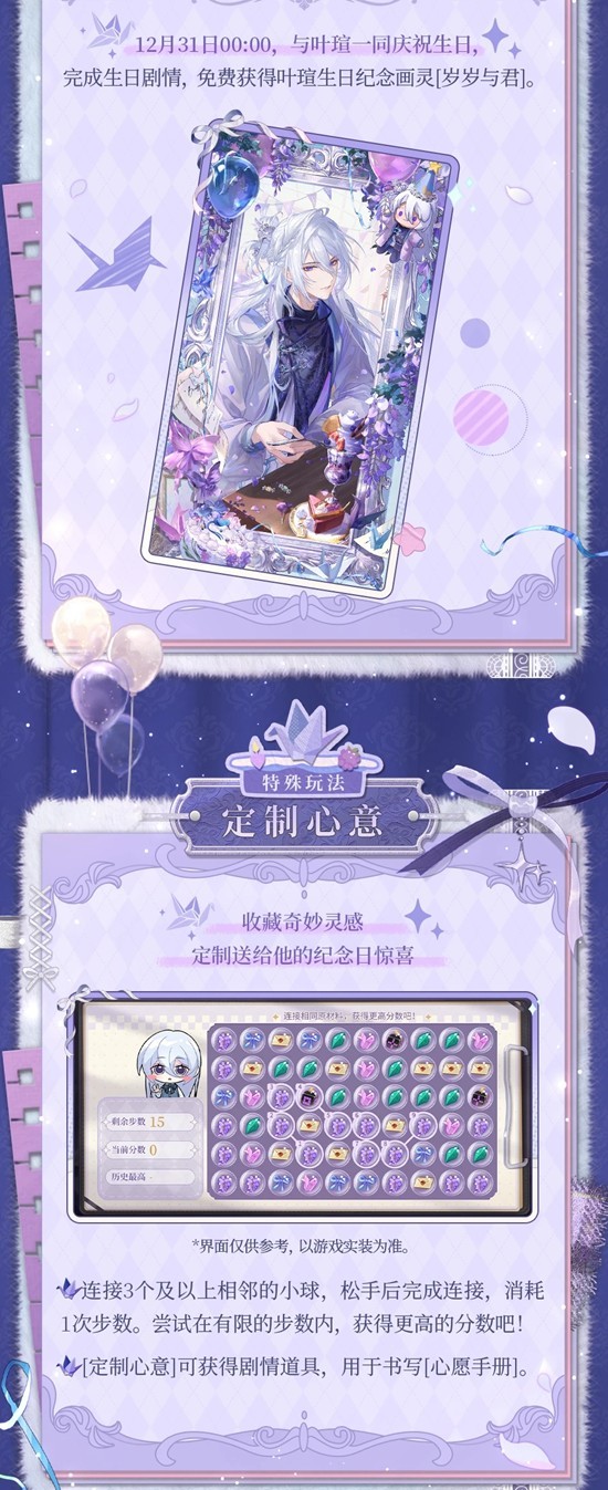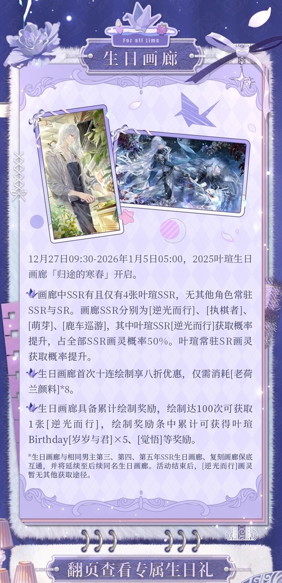►12月27日09:30 - 2026年1月5日05:00,2025叶瑄生日画廊「归途的寒春」开启。画廊中SSR有且仅有叶瑄SSR[逆光而行]、[执棋者]、[萌芽]、[鹿车巡游],无其他角色常驻SSR与SR。叶瑄SSR[逆光而行]、叶瑄常驻SR画灵获取概率提升。