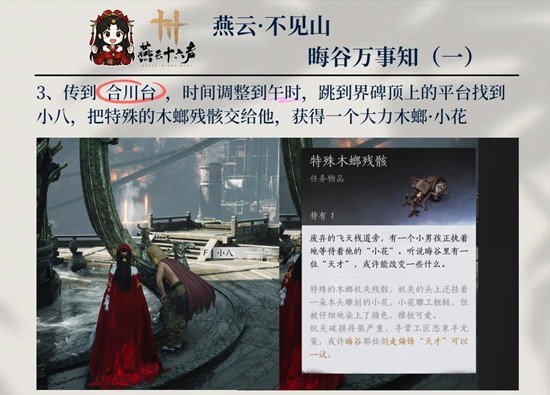 3、传到(合川台 ,时间调整到午时,跳到界碑顶上的平台找到小八,把特殊的木螂残骸交给他,获得一个大力木螂·小花