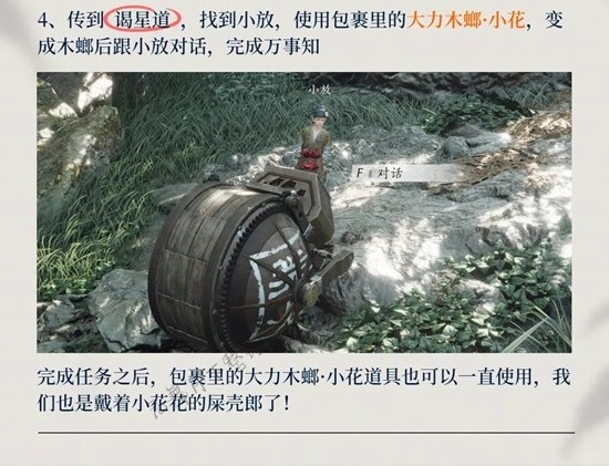4、传到谒星道 ,找到小放,使用包裹里的大力木螂·小花,变成木螂后跟小放对话,完成万事知