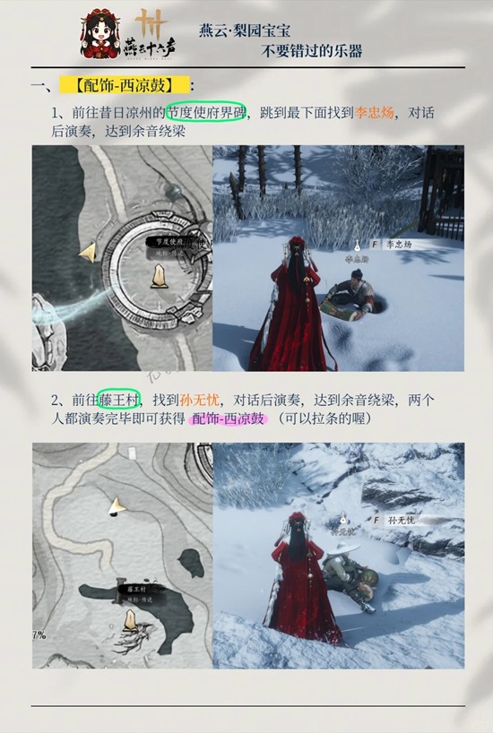 2、前往藤王村.找到孙无忧,对话后演奏,达到余音绕梁,两个人都演奏完毕即可获得 配饰-西凉鼓(可以拉条的)