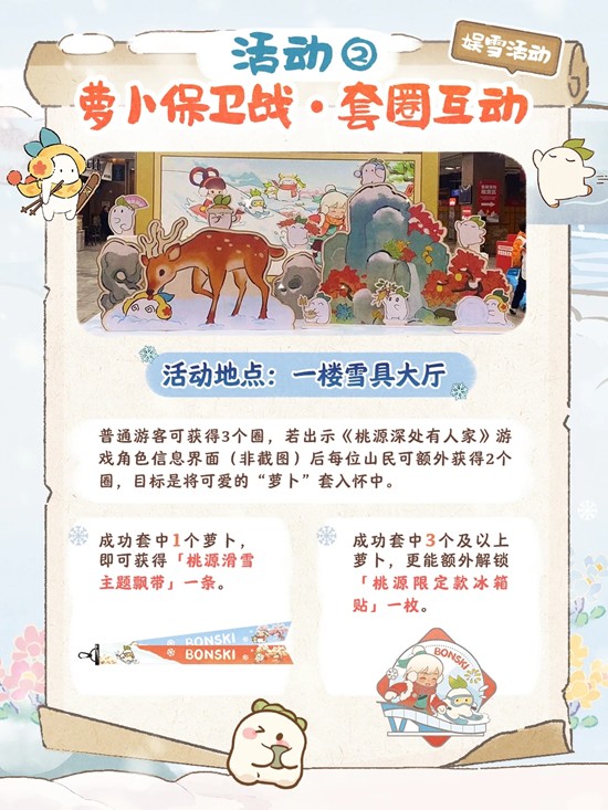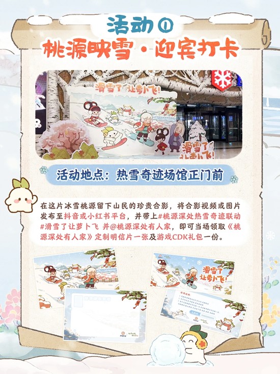 在这片冰雪桃源留下山民的珍贵合影,将合影视频或图片发布至抖音或小红书平台,并带上#桃源深处热雪奇迹联动#滑雪了让萝卜飞并@桃源深处有人家,即可当场领取《桃源深处有人家》定制明信片一张及游戏CDK礼包一份。