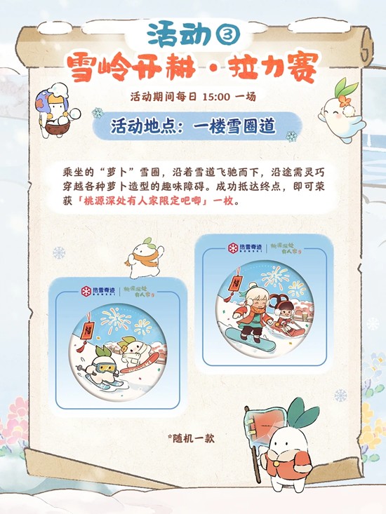 桃源深处有人家×热雪奇迹 哈尔滨热雪奇迹线下活动开启~桃源×哈尔滨热雪奇迹线下活动来袭,欢迎山民们前往线下与萝相聚~参与活动有机会赢取定制明信片、滑雪主题飘带、限定冰箱贴、限定徽章等活动专属好礼!一起来和小编看看吧~