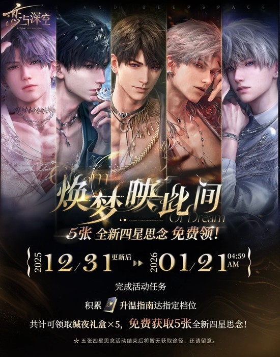 恋与深空二周年 5张全新四星免费领!「焕梦映此间」福利活动即将开启!2025年12月31日更新后~2026年1月21日完成活动任务,积累「升温指南」达指定档位,即可免费领取「缄夜礼盒×5」,免费获取5张全新四星思念!一起来和小编看看吧~