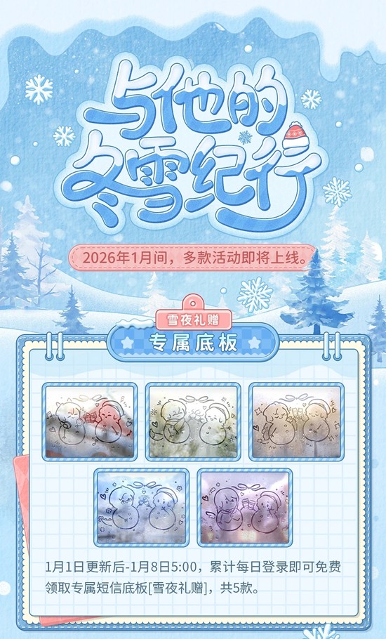 1月1日更新后-1月8日5:00,累计每日登录即可免费领取专属短信底板[雪夜礼赠],共5款。