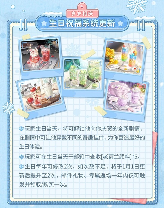 玩家可在生日当天于邮箱中查收[老荷兰颜料]*5。类生日每年可修改2次,如次数不足,将于1月1日更新后提升至2次,邮件礼物、专属返场一年内仅可触发并领取/购买一次。